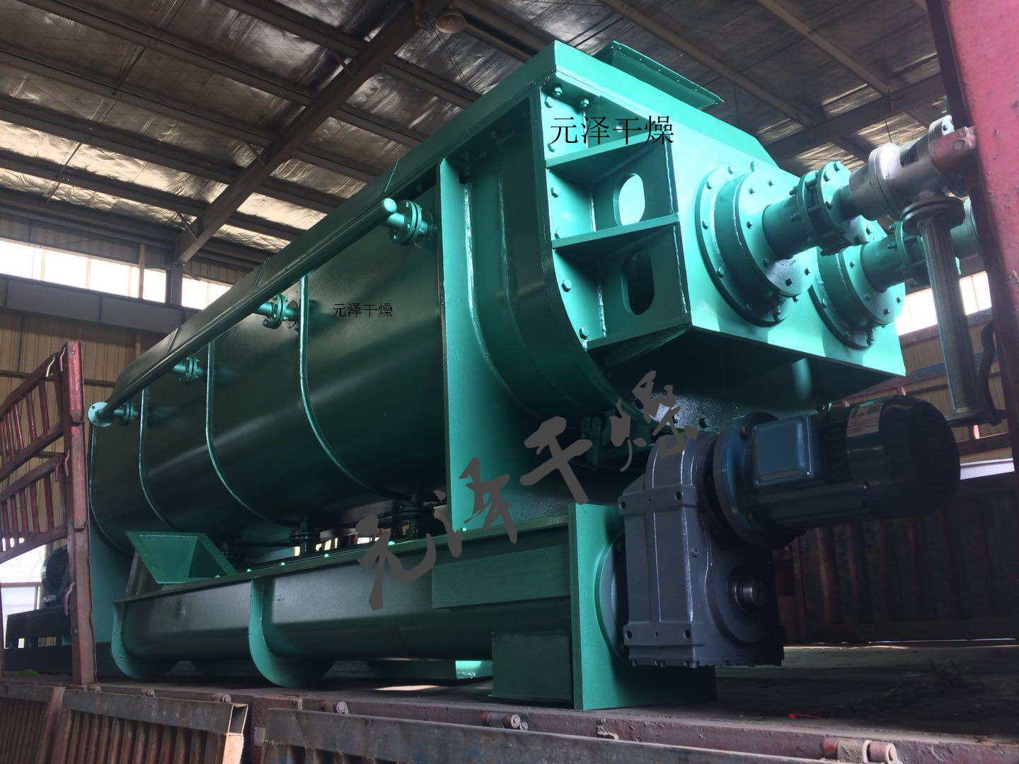 空心軸上密集排列著楔型中空漿葉,熱介質(zhì)經(jīng)空心軸流經(jīng)漿葉。單位有效容積內(nèi)傳熱面積很大,熱介質(zhì)溫度從-40℃到320℃,可以是水蒸汽,也可以是液體型:如熱水、導(dǎo)熱油等。間接傳導(dǎo)加熱,沒(méi)有攜帶空氣帶走熱量,熱量均用來(lái)加熱物料。熱量損失僅為通過(guò)器體保溫層向環(huán)境的散熱。楔型漿葉傳熱面具有自清潔功能。物料顆粒與楔型面的相對(duì)運(yùn)動(dòng)產(chǎn)生洗刷作用,能夠洗刷掉楔型面上附著物料,使運(yùn)轉(zhuǎn)中一直保持著清潔的傳熱面。漿葉干燥機(jī)的殼體為Ω型,殼體內(nèi)一般安排二到四根空心攪拌軸。殼體有密封端蓋與上蓋,防止物料粉塵外泄而充分發(fā)揮作用。