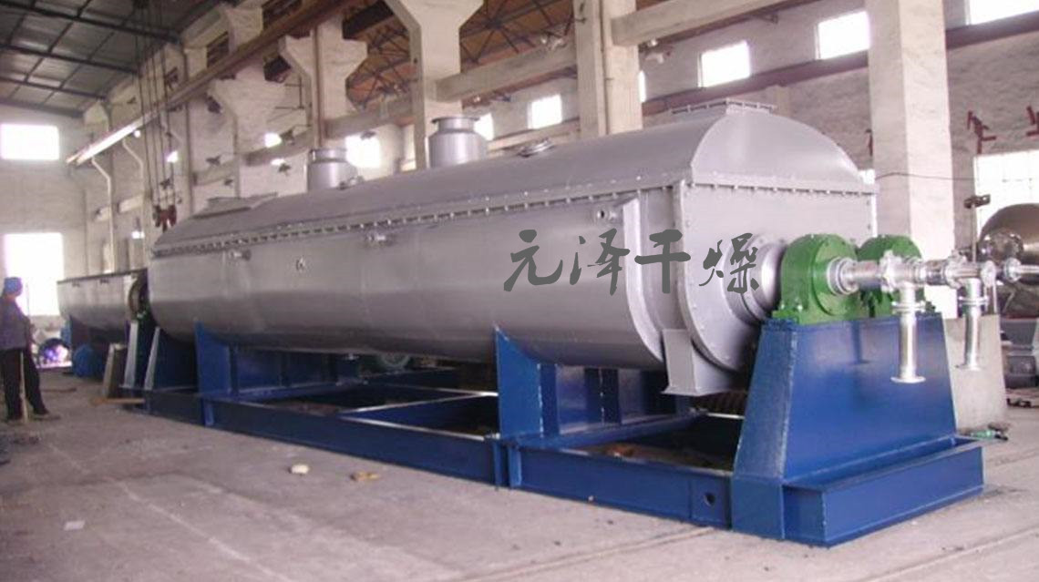 空心軸上密集排列著楔型中空漿葉,熱介質(zhì)經(jīng)空心軸流經(jīng)漿葉。單位有效容積內(nèi)傳熱面積很大,熱介質(zhì)溫度從-40℃到320℃,可以是水蒸汽,也可以是液體型:如熱水、導(dǎo)熱油等。間接傳導(dǎo)加熱,沒有攜帶空氣帶走熱量,熱量均用來加熱物料。熱量損失僅為通過器體保溫層向環(huán)境的散熱。楔型漿葉傳熱面具有自清潔功能。物料顆粒與楔型面的相對(duì)運(yùn)動(dòng)產(chǎn)生洗刷作用,能夠洗刷掉楔型面上附著物料,使運(yùn)轉(zhuǎn)中一直保持著清潔的傳熱面。漿葉干燥機(jī)的殼體為Ω型,殼體內(nèi)一般安排二到四根空心攪拌軸。殼體有密封端蓋與上蓋,防止物料粉塵外泄而充分發(fā)揮作用。